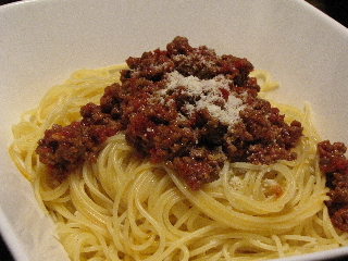 キッチンで湯がいたパスタでOKだがミートソースはじっくり薪ストーブで炒め、煮込むと美味しい |