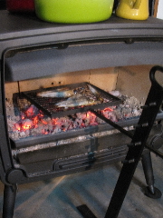 ピザ台をセットしてでスキレットでイトヨリを焼く 薪ストーブの炉内で扉を開けたまま ていねいに焼き上げる |