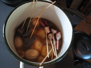 牛スジを丁寧に茹でこぼし酒で煮込む タコと昆布と水を加え、煮立てば昆布を出す 醤油で味を整える 下ゆでしたこんにゃくを加え煮込む、タコとコンニャクを食べ、ダシとスジは残して上記のダシにする アンコールは沸騰が得意な薪ストーブ、仕込みも高速でOK