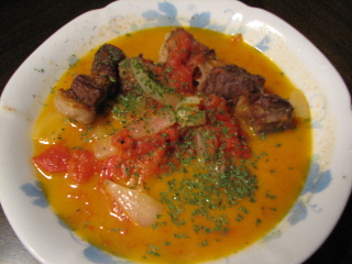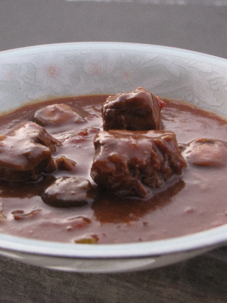 サラダオイルで煮込み用の牛バラ肉を炒め、玉ねぎのみじん切りを加え、頃合で白ワインとホールトマトを加え、薪ストーブでコトコト煮込む 塩コショウで味を調え、パセリを振る 煮込み過ぎないで食べるのも美味しい(写真) |