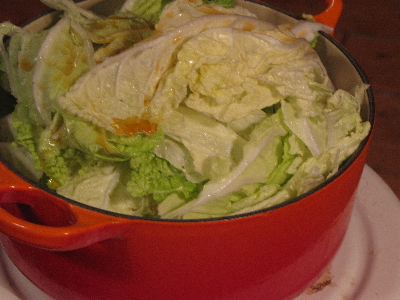 昆布ダシに酒で豚バラスライスと白菜を芯の方から取って、重ねて蒸し上げる 薪ストーブは強火でOK 醤油で味を調える イリコだしも美味しい 上下に素材重ねが薪ストーブにはいい |