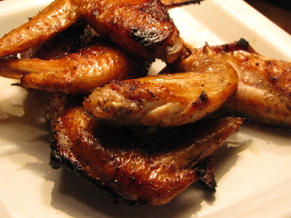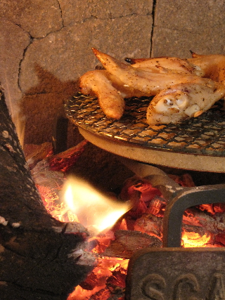 薪ストーブの炉内で塩コショウした手羽先を焼く スタンドにピザプレート、アミをセットするだけで焼き加減が違う 下からの直火がない分仕上がりが違う