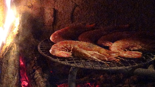 エビに塩を振る、薪ストーブの炉内の炎が落ちついた頃(炭火状態)スタンドを立てアミをセット、充分焼いてエビを乗せる