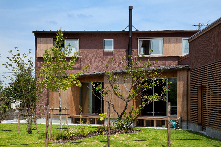 建物に黒い煙突がアクセントになっています