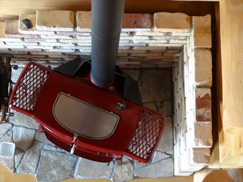 既存ログハウスでアンコール赤をお使いになっていたOさまがニューアンコール赤を設置 デザインは同じ、内部の燃焼構造が違う最新薪ストーブ 暖房も強力でお湯もガンガン沸く
