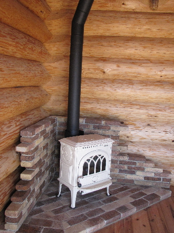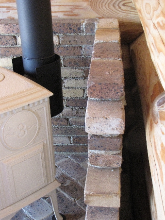 ログハウスのコーナーに壁、床レンガでステージ
