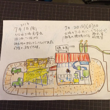 会場は、神山道の駅を越えてしばらくして、石井方面へ右折、下り坂を下ってスグに右折すると左がわに見える赤い屋根の倉庫です。